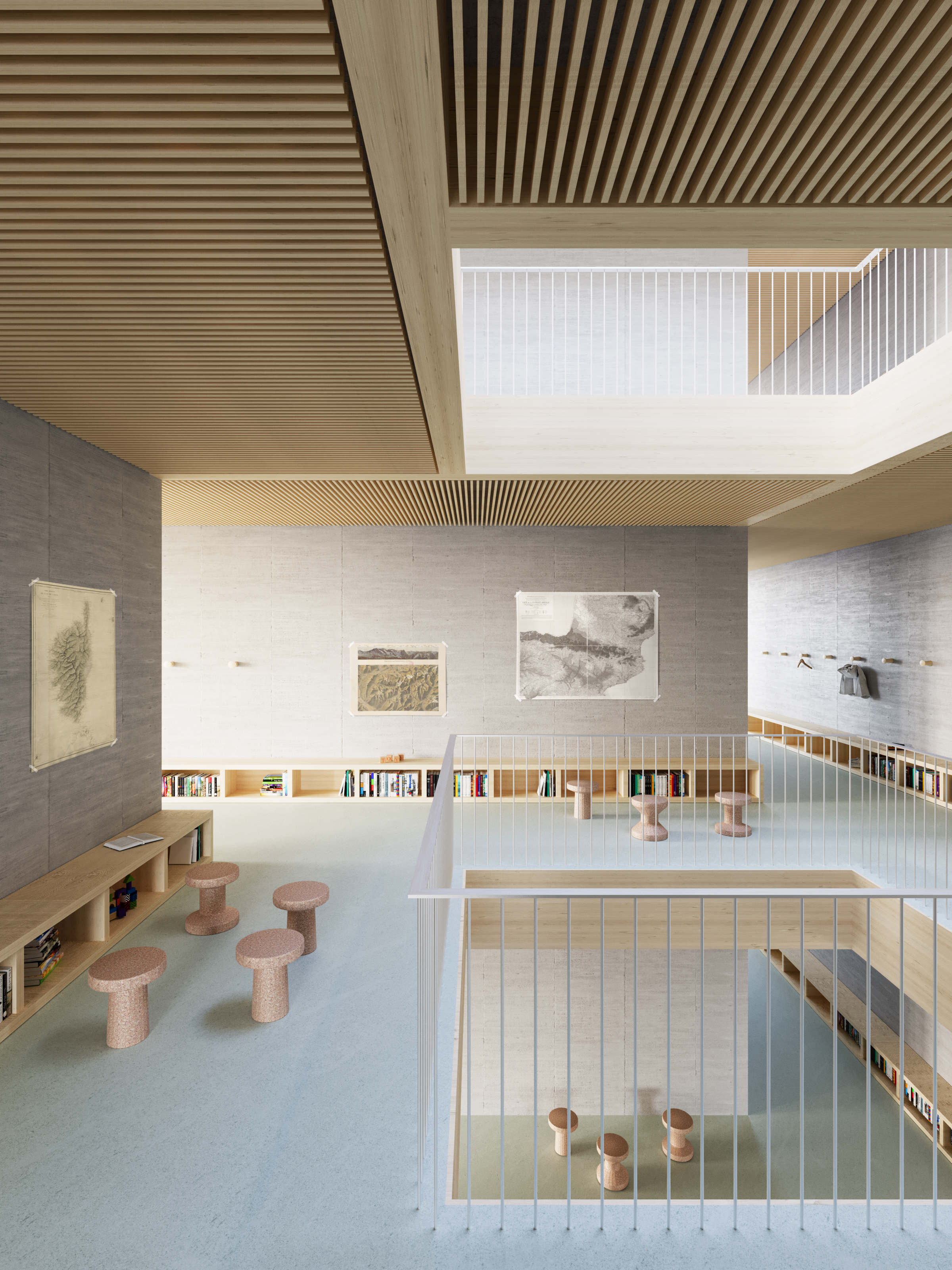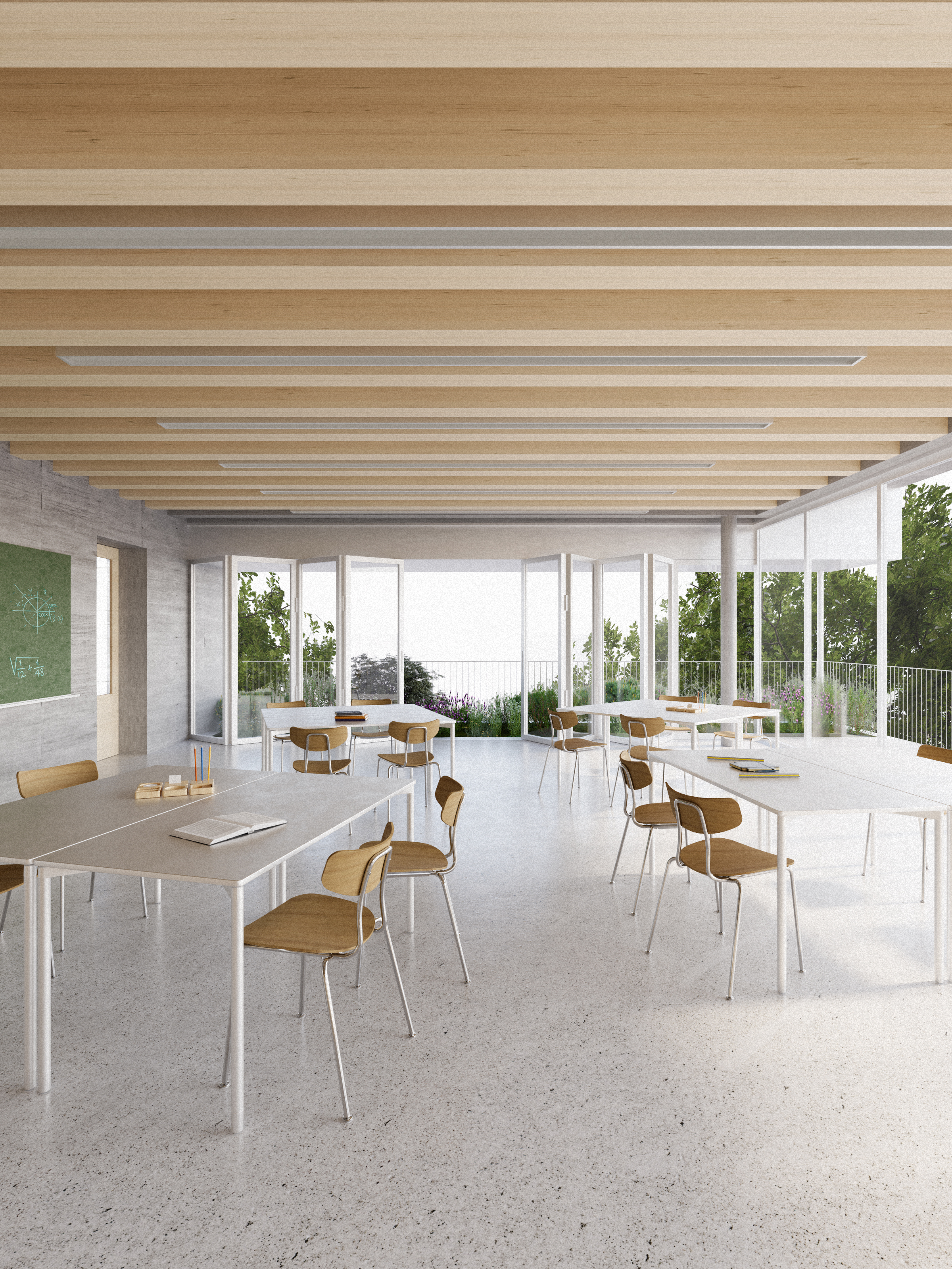 This guided our approach for this new school building near Zurich. The park-like landscape surrounding the building reaches into the classrooms through open façades and deep balcony planters. The ever-changing shadow play of leaves is envisioned as a constant, calming companion to the students in their everyday school life.