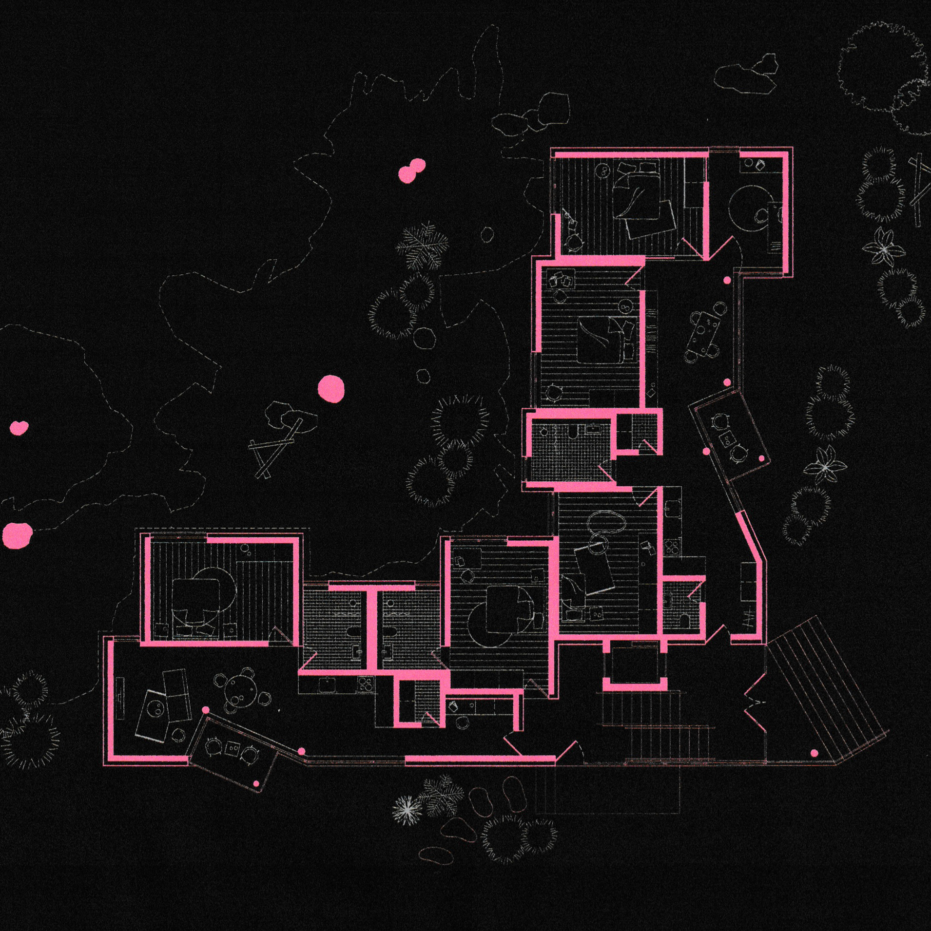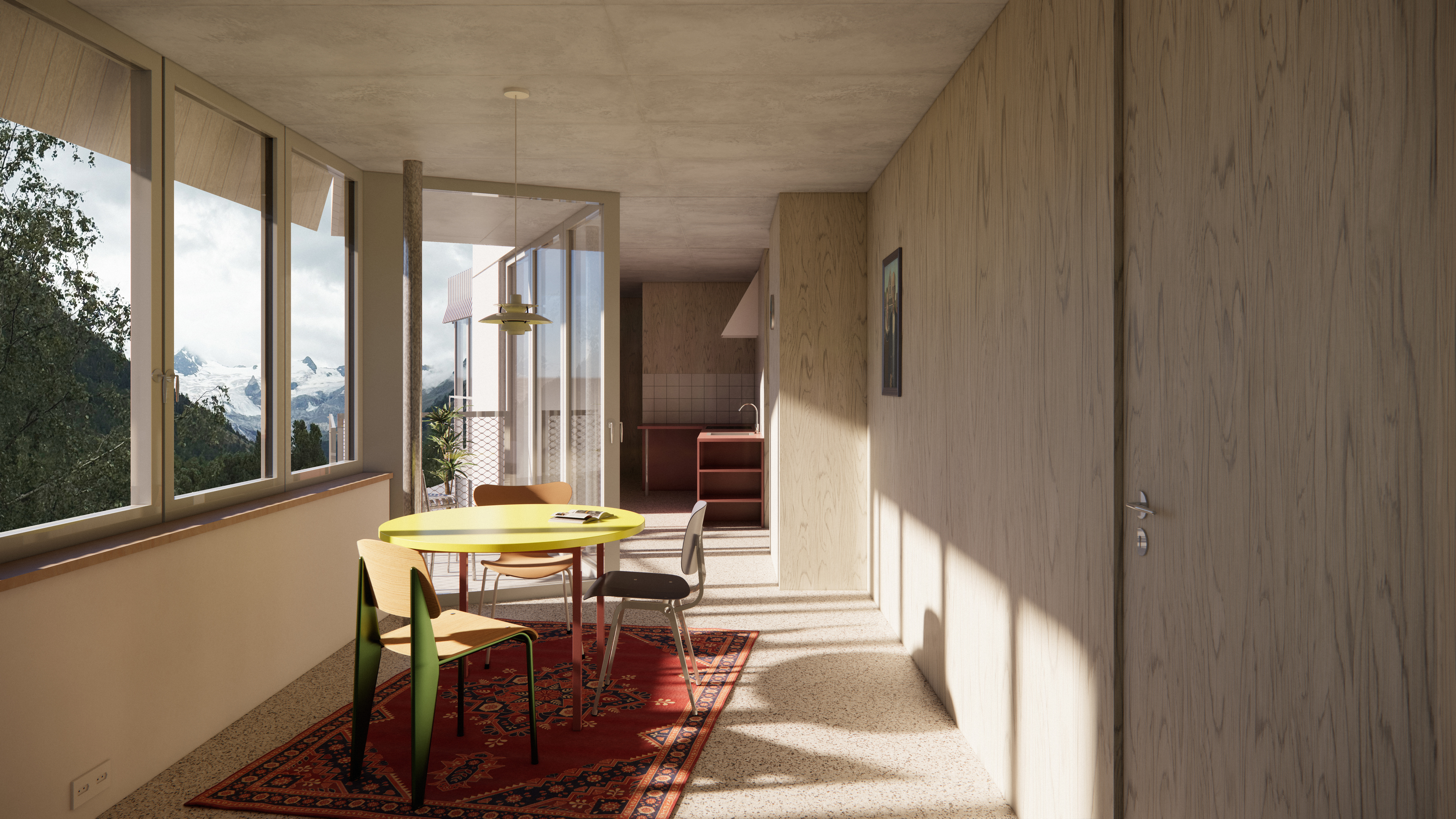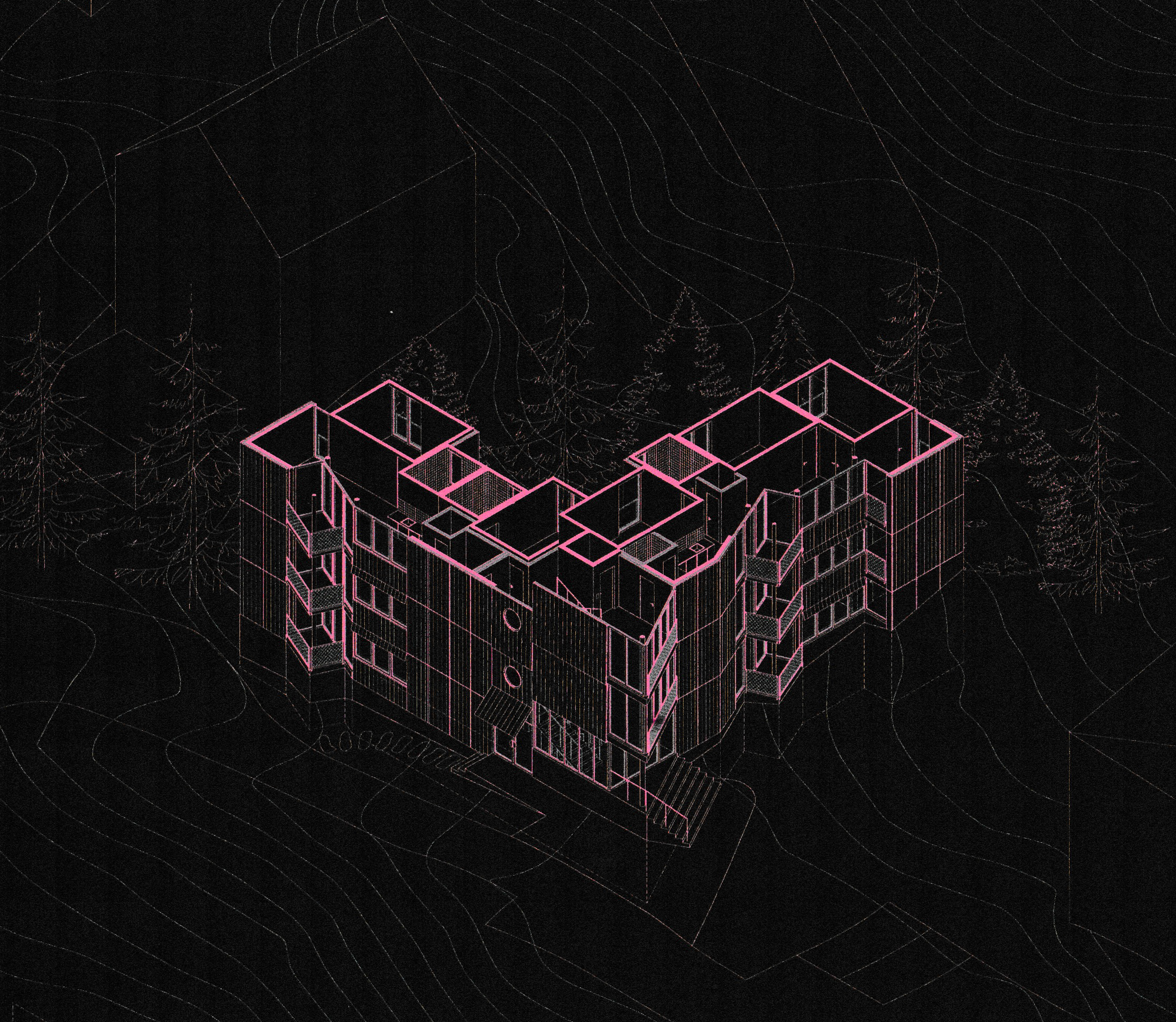 The sloping terrain, the towering larches, and the view of Piz Bernina define the site, where a residential building of eight apartments is envisioned for Pontresinas Pilotprojekt 2401 competition. Just as the woodpecker (Buntspecht) moves with effortless grace among the treetops, inhabiting them and making them its own, the new building gently embraces the existing trees. In this way, a softly meandering form takes shape, winding around the larches and ascending the hillside like a whispered gesture of the landscape itself.