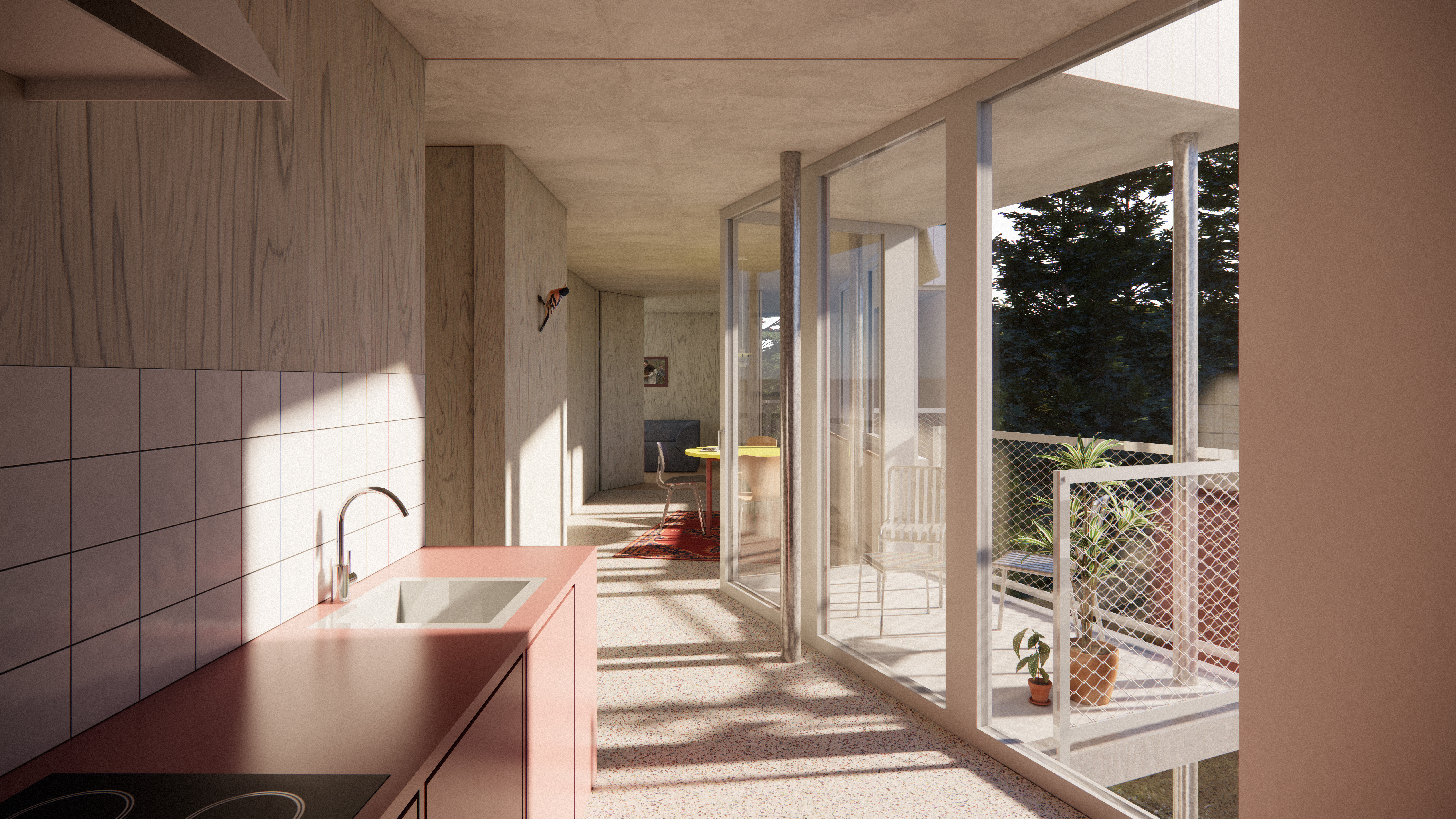 The bedrooms are conceived as elemented, load-bearing timber boxes, arranged intimately around the trees. Their projections and recesses, together with the inset balconies, sculpt the spatial rhythm and articulate the living areas beyond. Some of the bedrooms can be seamlessly opened into the living spaces through strategically positioned doors, allowing them to become part of the whole. This flexibility ensures that each apartment can respond gracefully to the shifting rhythms of daily life, adapting with ease to the needs of its inhabitants.